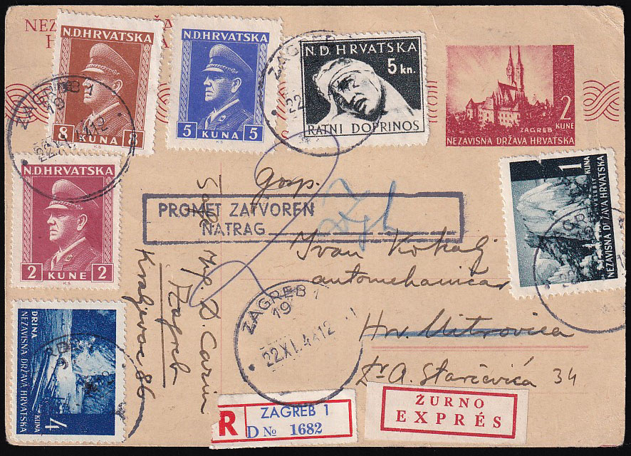 Opis: Dopisnica upućena žurno i preporučeno iz Zagreba u Hrvatsku Mitrovicu 22.01. 1944. Zbog ratnih djelovanja promet zatvoren i pošiljka je vraćena pošiljatelju. Vrlo šarena i gotovo točna frankatura (2 kn. dopisnica, 9 kn. preporuka i 10 kn. žurno, 5 kn. ratni doprinos). Dobra kvaliteta, rijetko.