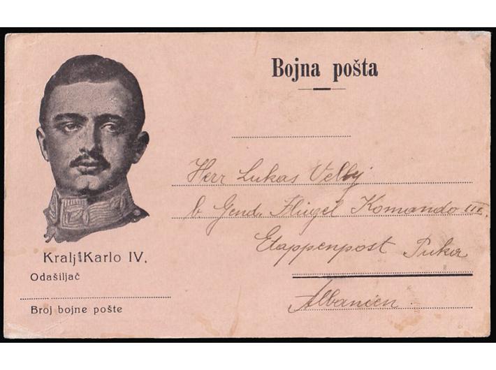 - Dopisnica za bojnu poštu na hrvatskom jeziku s ilustracijom cara i kralja Karla IV