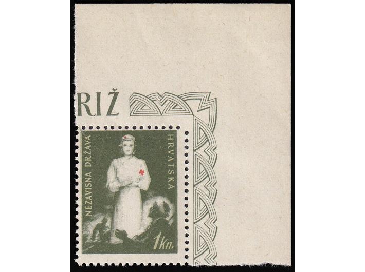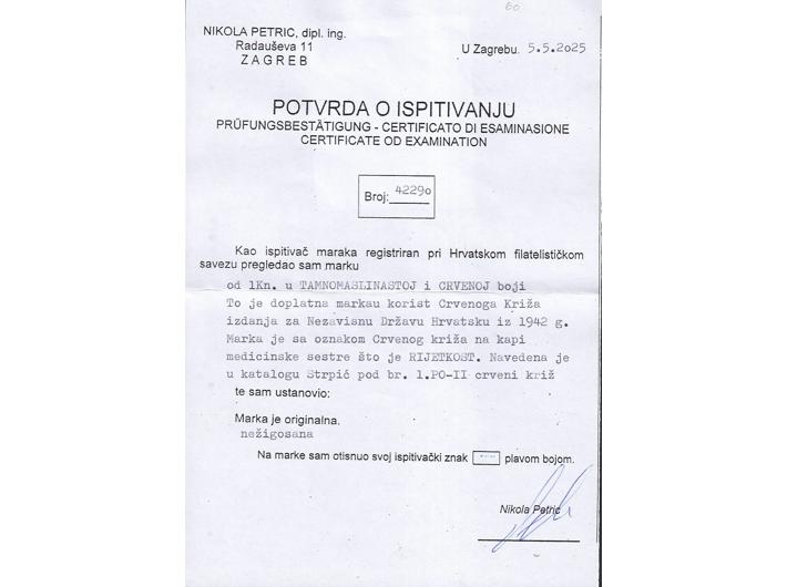 Opis: Doplatna marka br. 1 s pogreškom tiska, crveni križ na kapi. Opisano u BP za NDH pod 1. PO-II. Blagi pomak crvene boje u lijevo. Fotoatest Petric. Odlična kvaliteta.