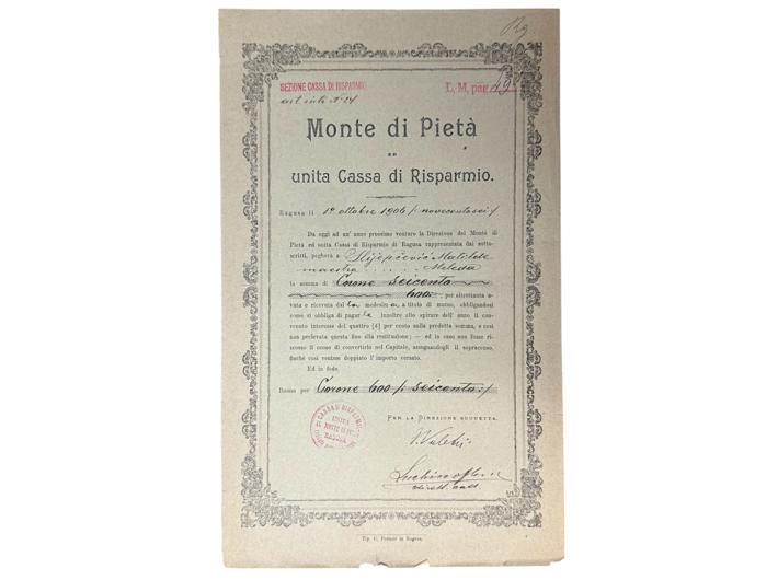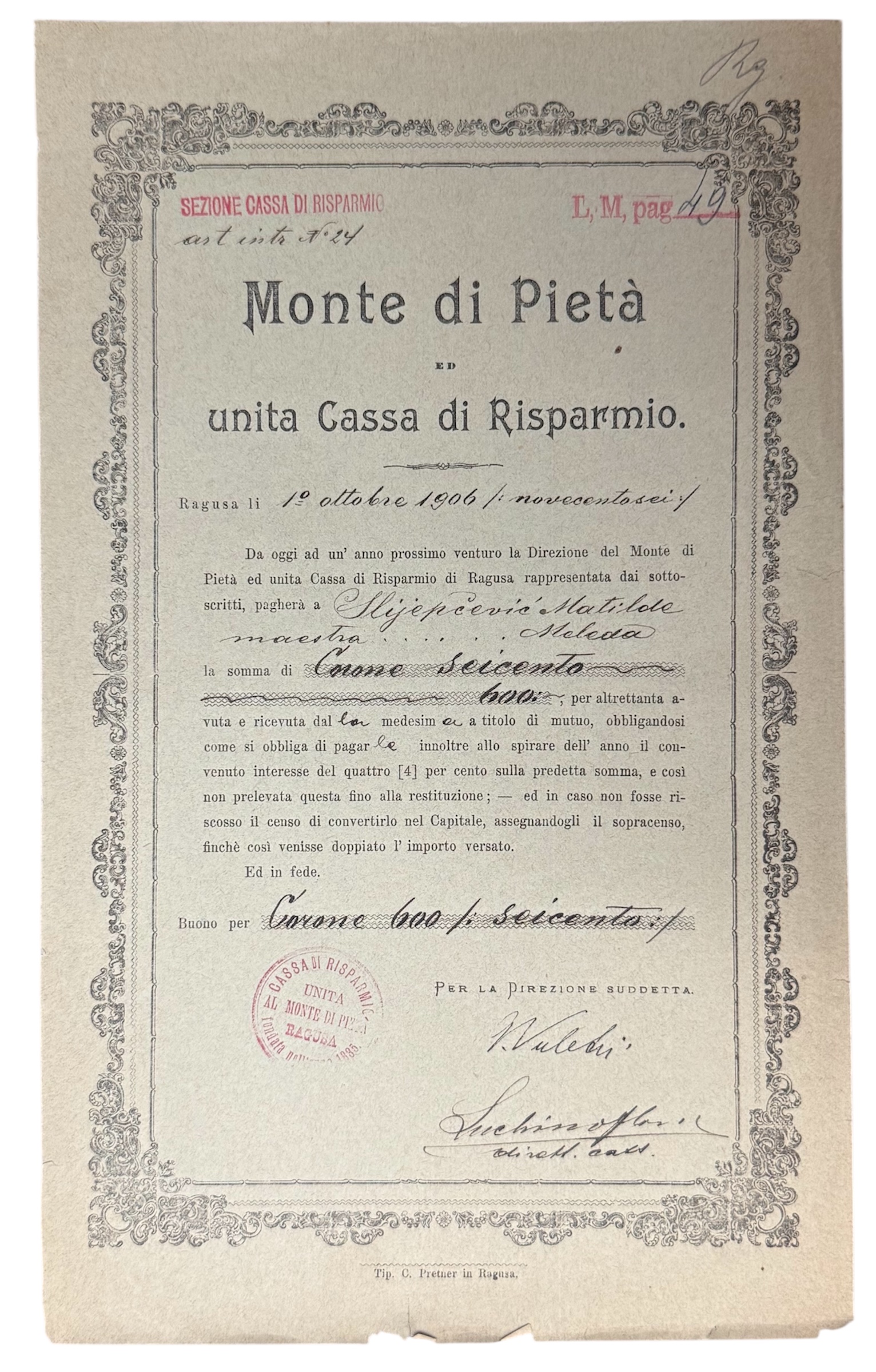 - DUBROVNIK-RAGUSA, dionica "ŠTEDIONICA MONTE DI PIETA", 600 kruna, 1. listopad 1906.