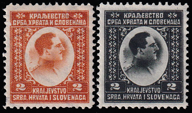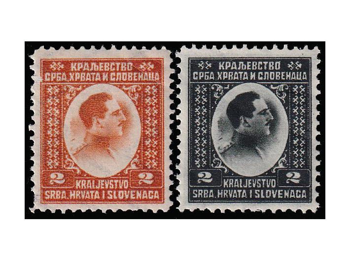 Opis: Dva probna otiska neprihvaćenog idejnog rješenja za franko-niz Kraljevine SHS na gumiranom i vodoznakom zaštićenom papiru. Tiskano u Njemačkoj tiskari F. Bruckman. Opisano u priručniku HFS br. 8 na str 53/54. Odlična kvaliteta.