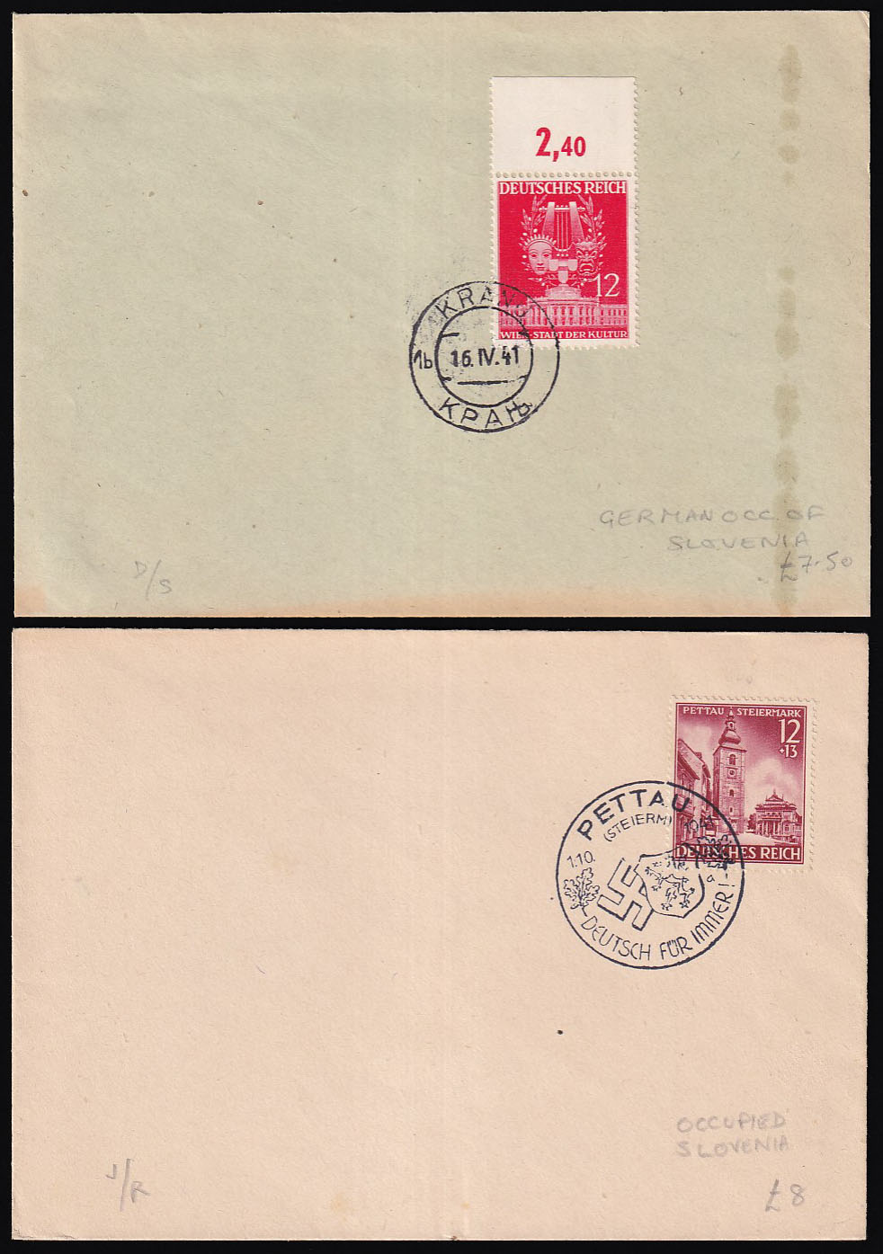 Dvije koverte sa markama Reicha i žigovima Kranj i Pettau.