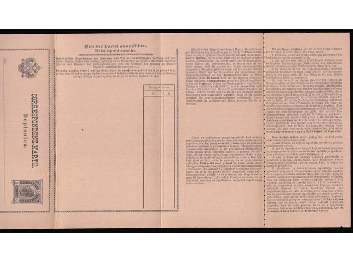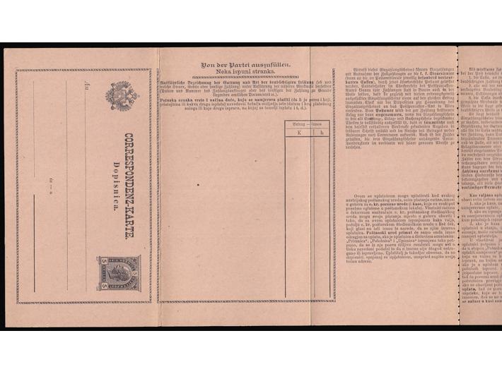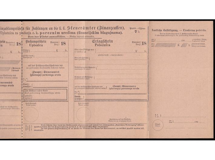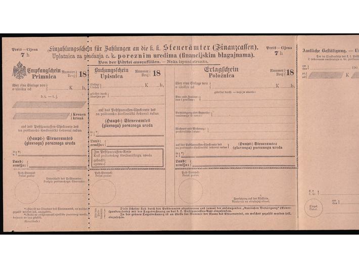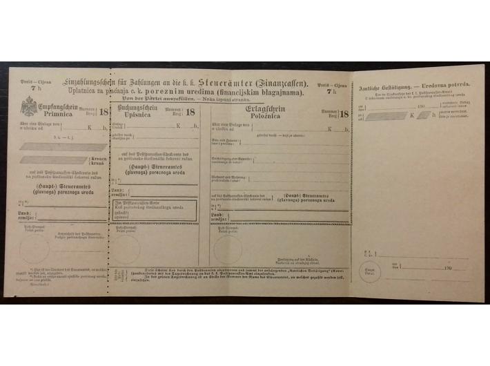 Opis: Dvojezična dopisnica-formular za prijavu i plaćanje poreza poreznim uredima tj. financijskim blagajnama. Michel br. STA 15. Vrlo rijedak formular u odličnoj kvaliteti.