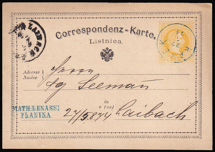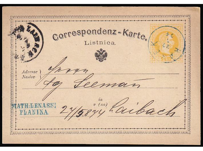 - Dvojezična dopisnica upućena iz Rakeka u Ljubljanu 27.07. 1874.