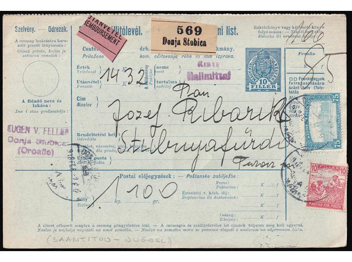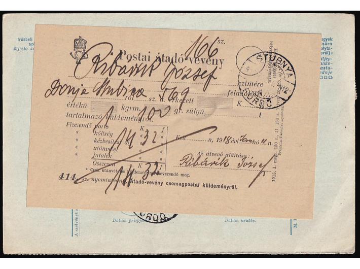 - Dvojezična paketna karta s kuponom, za paket upućen iz Donje Stubice u Mađarsku 02.02. 1918.