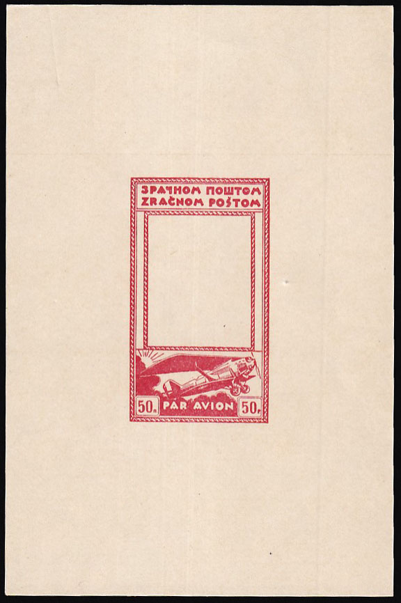 - Esej za dopisnicu zračne pošte nominale 50 para na tvrđem žućkastom kartonu u crvenoj boji.