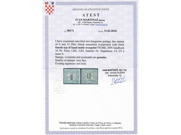 Opis: FIUME porto 6 i 12 crne brojke, ručni pretisak IV tip. Fotoatest Martinaš.