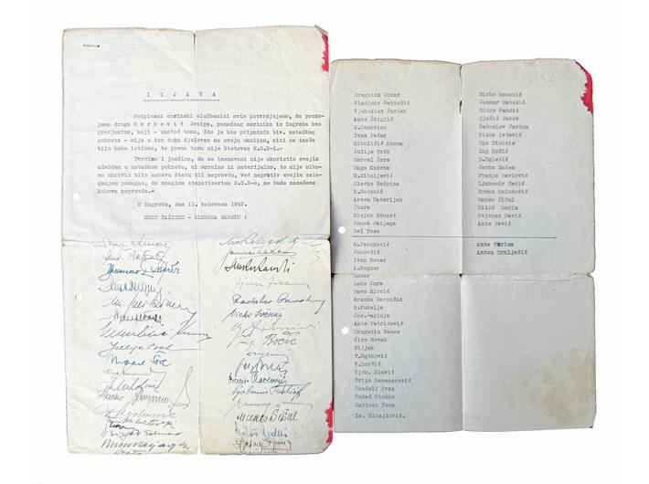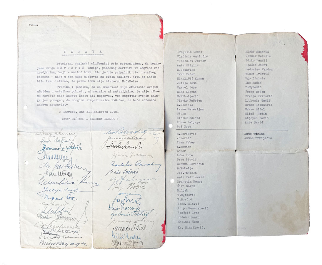 Opis: FNRJ - NDH, izjava kojom se 59 ljudi izjašnjava da je Marković Josip bez obzira što je bio član ustaškog pokreta ustvari pomagao NOB, 1945