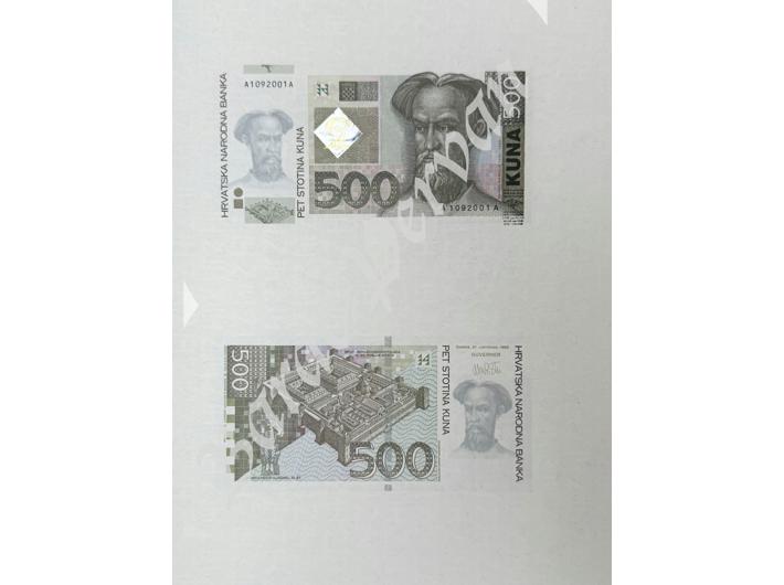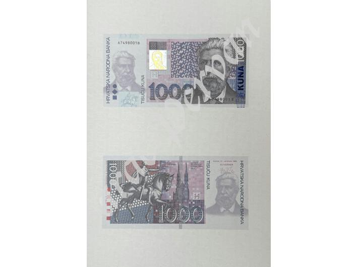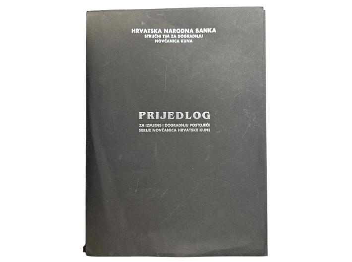 Opis: HRVATSKA, Kune, 1993 / 1995 probni tisak za izmjenu i dogradnju postojećih novčanica, svih 8 novčanica svaka u svojoj posebnoj mapi. Po navodima izrađeno je 8 primjeraka. Svaka novčanica ima tisak prednje i stražnje strane s opisima. Tisak je izvršen na posebnom papiru s vodoznakom HNZ (Hrvatski Novčarski Zavod). Izuzetna rijetkost i važan povijesni dokument.