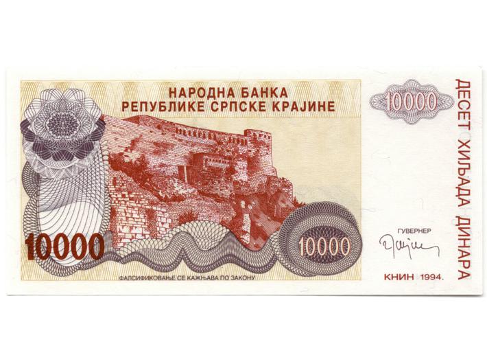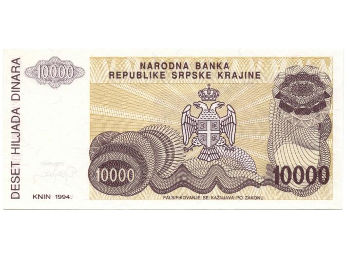Opis: HRVATSKA, okupacijski novac tzv. srpske krajine, 10.000 dinara 1994, bez serijskog broja, UNC
