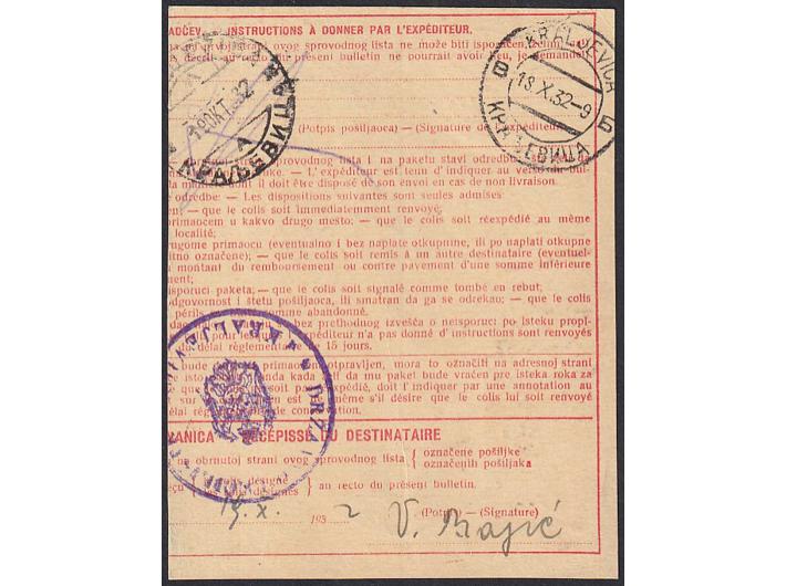 • Isječak paketne karte za paket upućen iz Šapca u Kraljevicu 17.10. 1932.