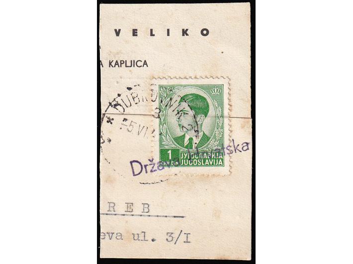 Opis: Isječak pisma upućenog iz Dubrovnika 05.06. 1941. Marka ručno pretisnuta novim nazivom države. Sve opisano u Acta Philatelica Nova 2014 na str 8/9 kao Dubrovački provizorij tip I.