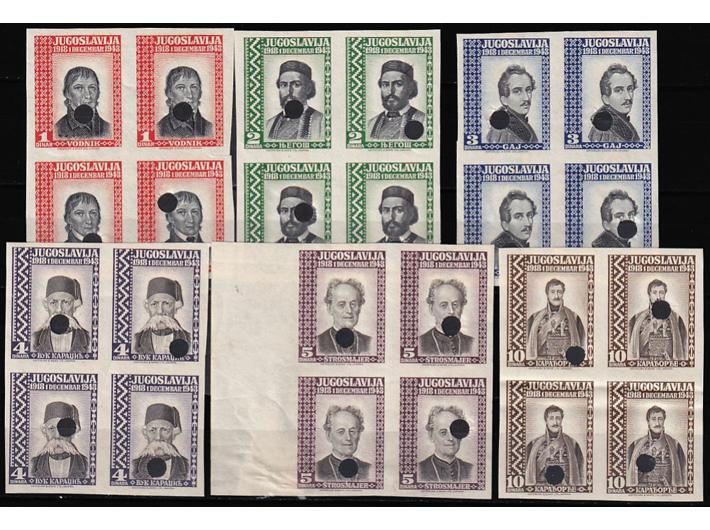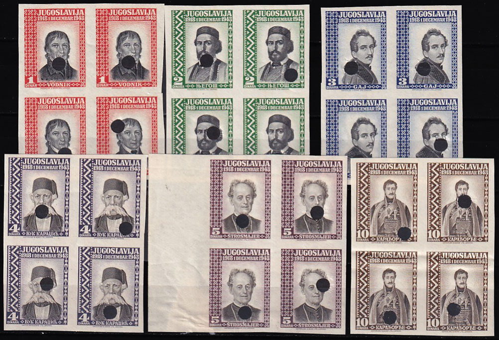 Opis: Izdanje u emigraciji, London. Niz od 6 nezupčanih četveraca na gumiranom papiru. Potječe iz arhive tiskare što potvrđuje i sigurnosna rupa na svakoj marci. Kod ovakvih probnih otisaka guma je razne kvalitete. Vrlo rijetko.