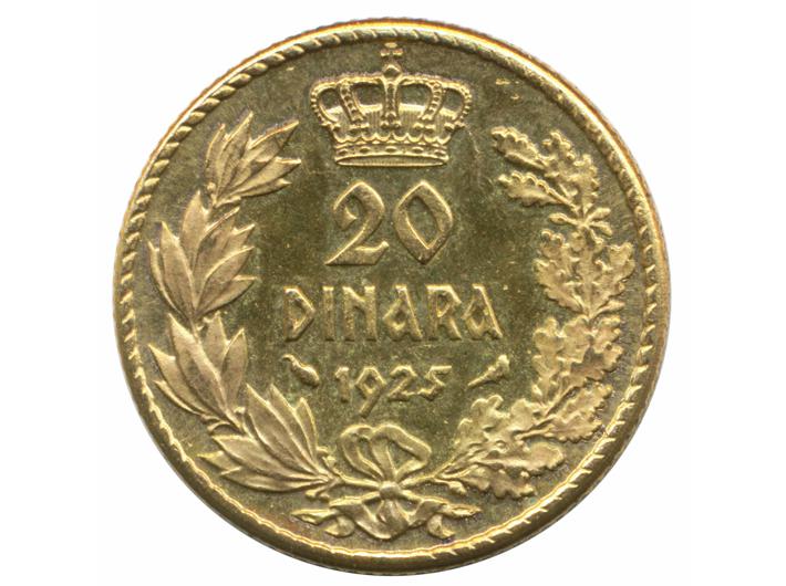 - Jugoslavija, Kraljevina, 20 dinara 1925, Au - 6,22 g UNC (kopija iz vremena - vidi Mandić 1995 strana 28)