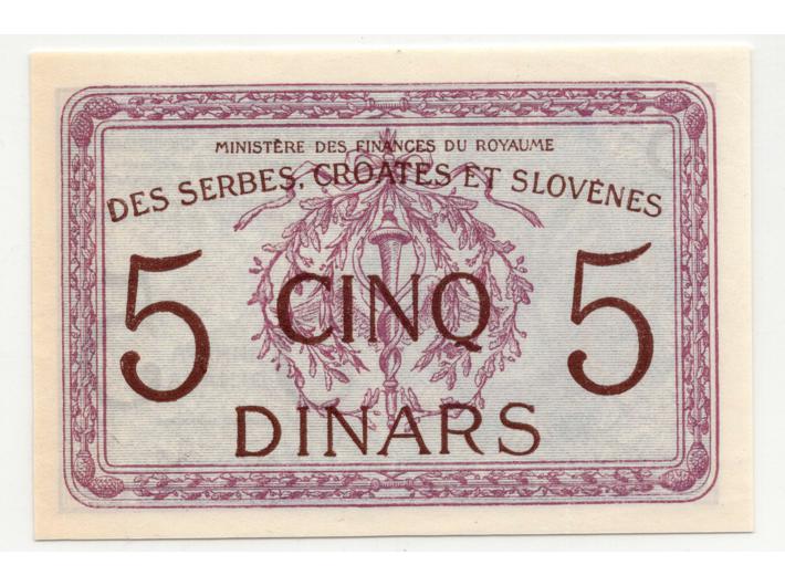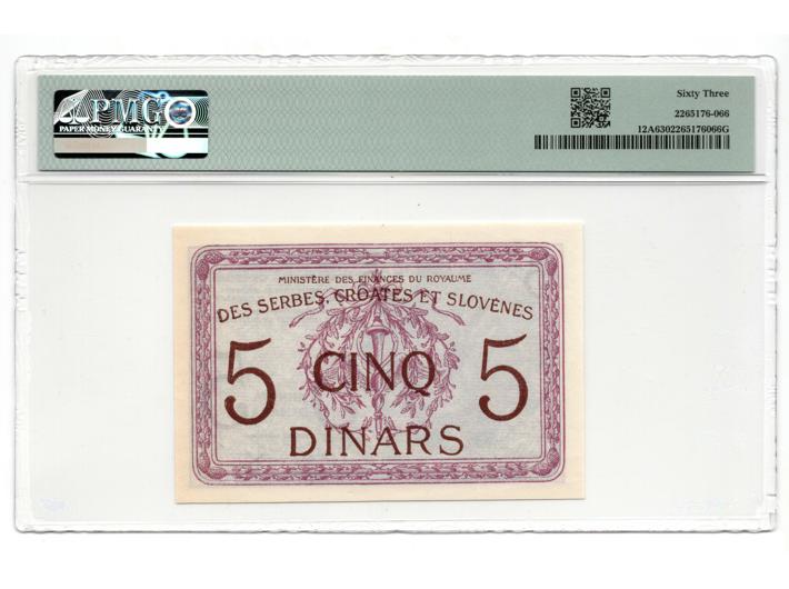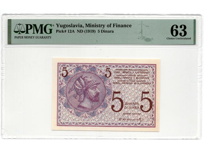 - Jugoslavija, kraljevina, 5 dinara 1919, uzorak bez serijskog broja, UNC gradirano PMG63, izuzetno rijetko
