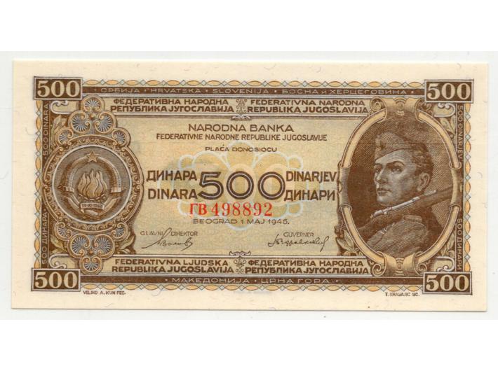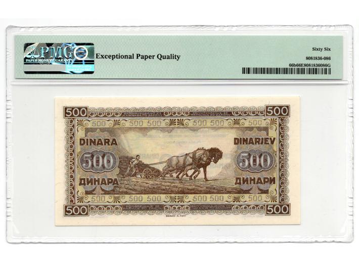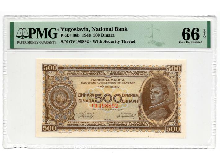 - Jugoslavija, socijalistička, 500 dinara 1946 s vodoravnom niti, gradirano PMG66, gem uncirculated