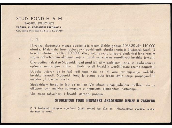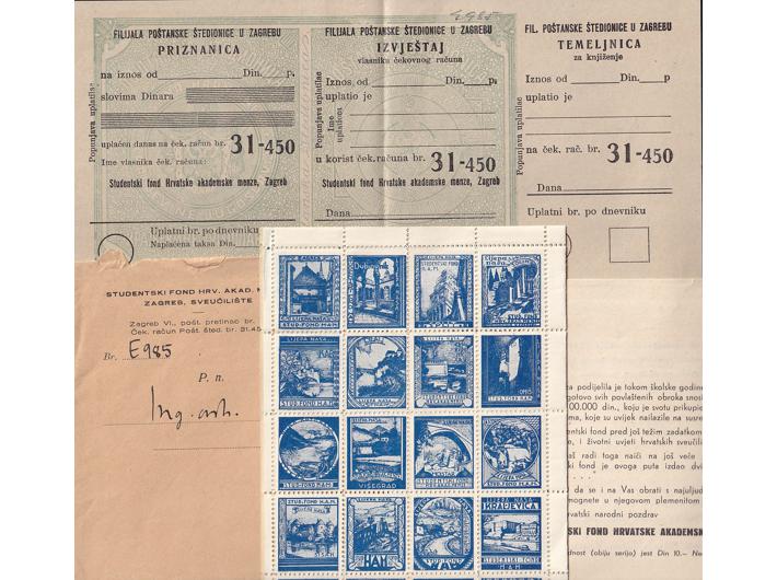 • Komplet: koverta, letak, ček i arak vinjeta za pomoć Hrvatske akademske menze sveučilišta u Zagrebu.