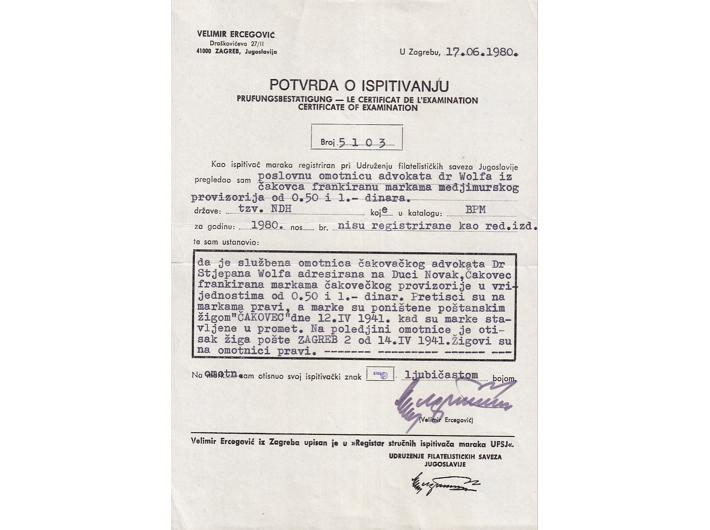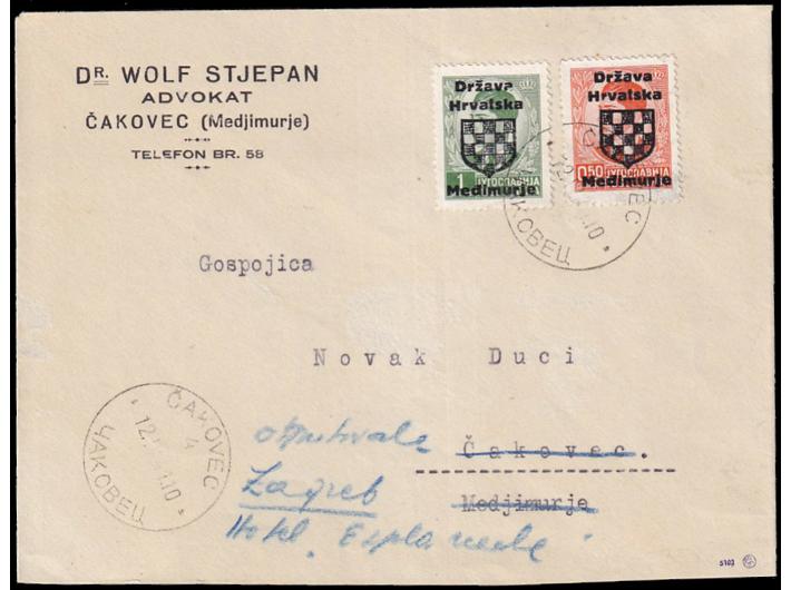 - Koverta frankirana markama 0,50 i 1 din. Međimurskog provizorija i upućena i loko Čakovec 12.04. 1941