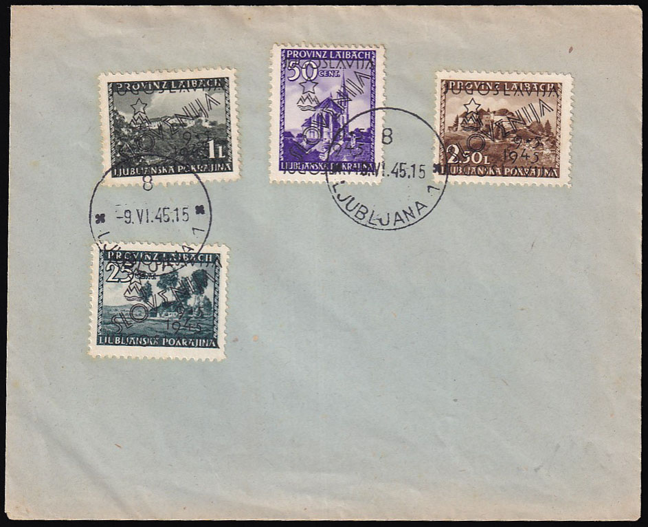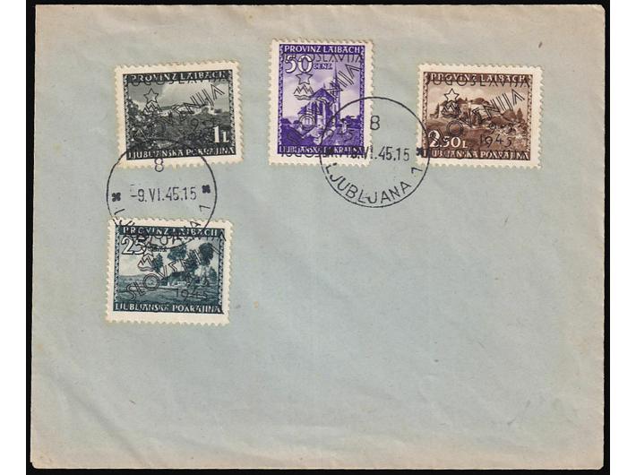 • Koverta s četiri marke provizornog izdanja za Ljubljanu poništena žigom Ljubljana.