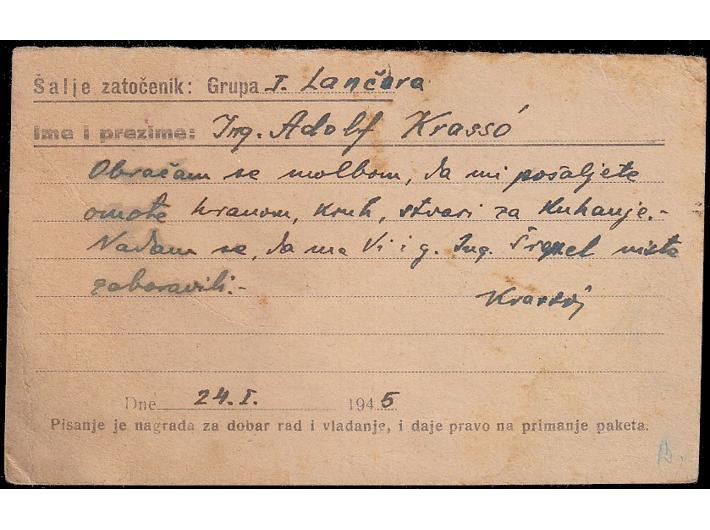 - Logorska dopisnica upućena iz logora Jasenovac u Zagreb 24.01. 1945.