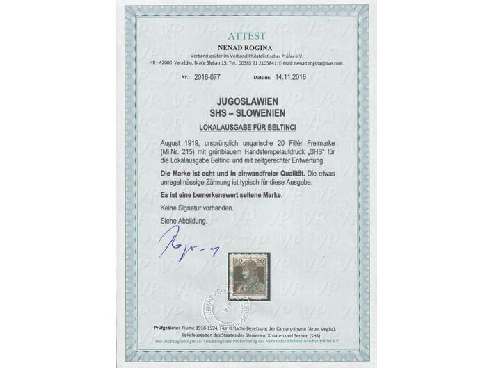Opis: Lokalno provizorno izdanje za Beltince Karlo 20 fillira. Prema literaturi pretisnuto je samo 10 primjeraka. Izuzetno rijetko. Fotoatest Rogina (...es ist eine bemerkenswert seltene Marke).