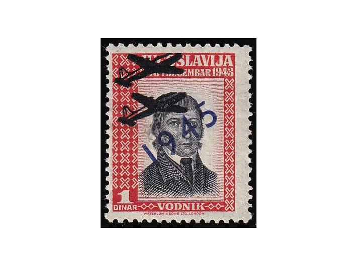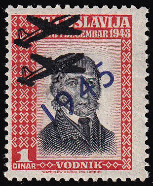 Opis: London izdanje u emigraciji, dvostruki otisak siluete zrakoplova na marku s prikazom Valentina Vodnika. Vrlo rijetko, dobra kvaliteta.