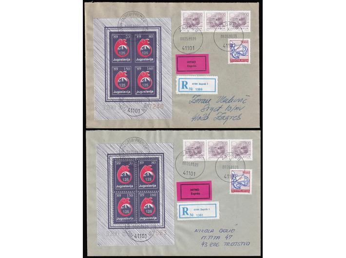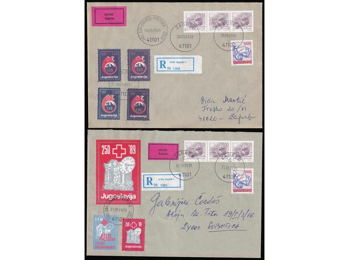 Opis: Lot četiri pisma preporučeno i žurno upućena loko Zagreb, Suboticu i Trojstvo, koja su uz redovitu frankaturu frankirana i markama crvenog križa poništenim žigom PRVI DAN sve 08.05. 1989 osim pisma za Suboticu koje je od 01.06. 1989. Odlična kvaliteta, rijetko.
