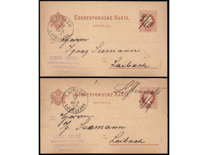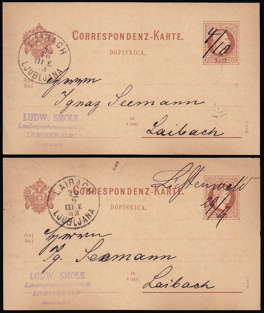 Opis: Lot dvije dopisnice upućene iz Lichtenwalda (Sevnica) u Ljubljanu. Jedna ručno poništena samo datumom zaprimanja 04.10. (1883) dok je na drugoj uz datum 29.09. (1883) napisano mjesto Lichtenwald. Dolazni žigovi, dobra kvaliteta.