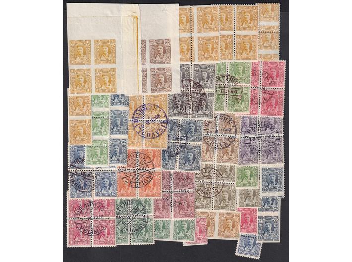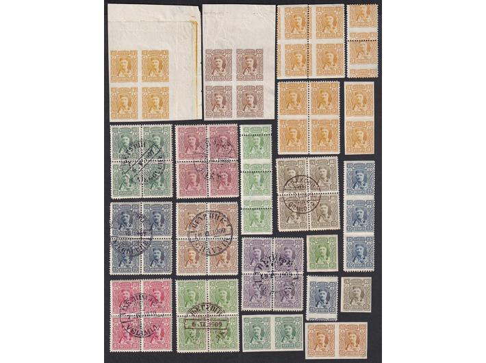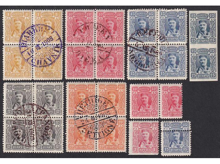 Opis: Lot maraka izdanja 1907. Razne pogreške zupčanja (dvostruki i pomaknuti) nezupčani parovi i četverci. Kompletna serija u četvercima poništena žigom Cetinje. Dobra kvaliteta.