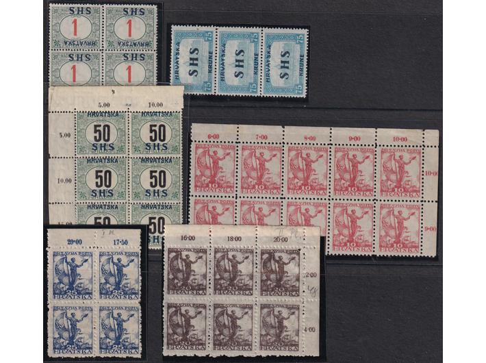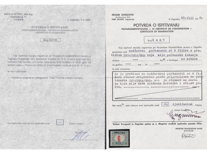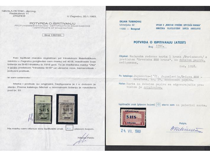 Opis: Lot provizornih i redovnih maraka SHS, većina atestirana. Porto četverac 1 heller obrnuti pretisak, porto 50 hell crne brojke, porto 6 fill (Ercegović) mornari 10 fill druga ploča na tankom papiru (Petric) okomiti trojac parlament 75 fill. s pretiskom KRUNE (Petric) Mornari 45 fil. prva ploča (Ercegović) Zita pretisak kamenotisak crni (Petric), 20 fill osmerac mornara I ploča, parlament pretisak 1 kruna na debelom papiru (Tubinović) ex. Vilfan