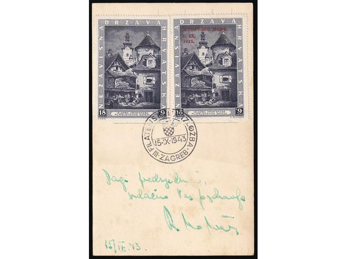 Opis: Maksimum karta s markama Michel br. 115 i 117 i ručnim žigom 15.08. 1943., te kratkom porukom i potpisom Radoslava Horvata. Odlična kvaliteta, rijetko.