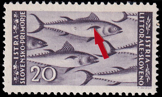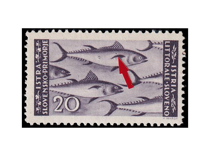 • Marka 20 lira Ljubljansko izdanje, tvrda smeđa guma, pogreška tiska, točka iznad peraje.