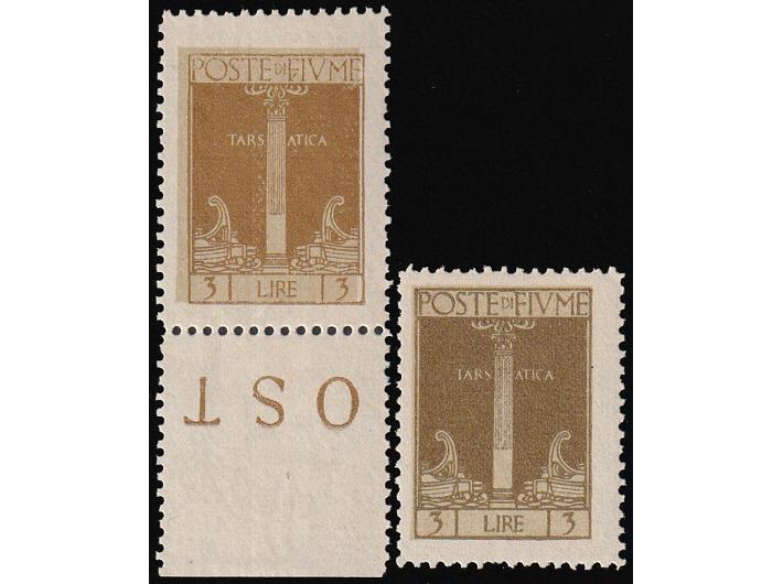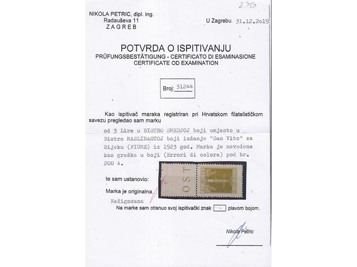 Opis: Marka 3 lire iz niza Riječki motivi u bistrosmeđoj umjesto bistro maslinastoj boji. Pogreška opisana u Sassone pod 200a. Odlična kvaliteta, vrlo visoka kataloška cijena fotoatest Petric.