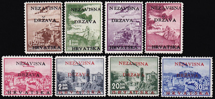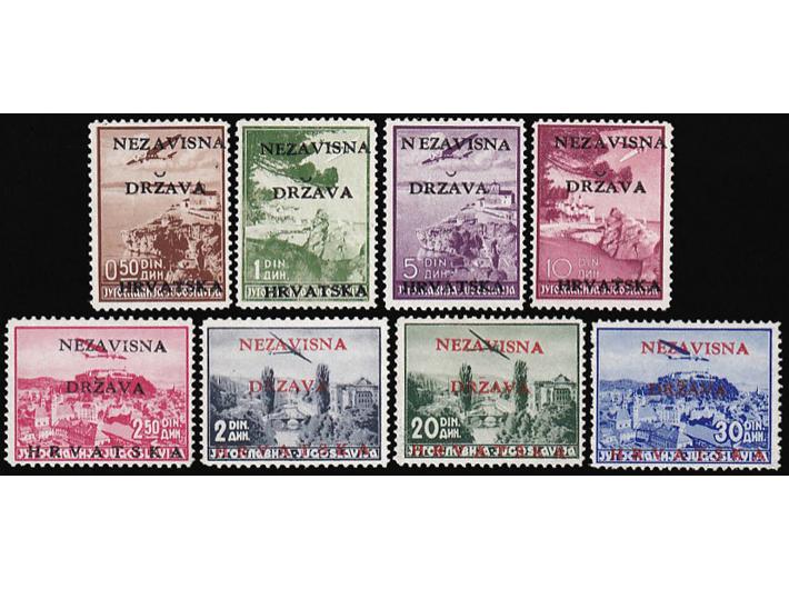 Marke kraljevine Jugoslavije Michel br. 340/347 s trorednim pretiskom NEZAVISNA / DRŽAVA / HRVATSKA u crnoj i crvenoj boji.
