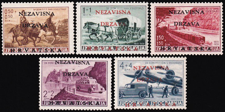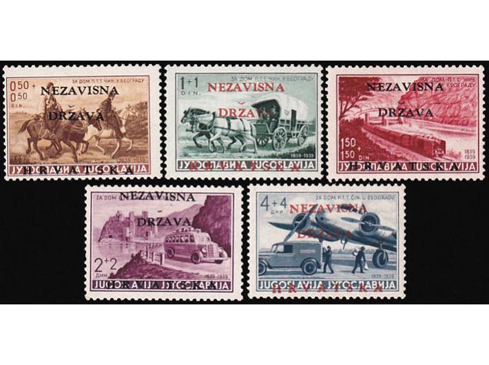 Marke kraljevine Jugoslavije Michel br. 370/374 s trorednim pretiskom NEZAVISNA / DRŽAVA / HRVATSKA u crnoj i crvenoj boji.