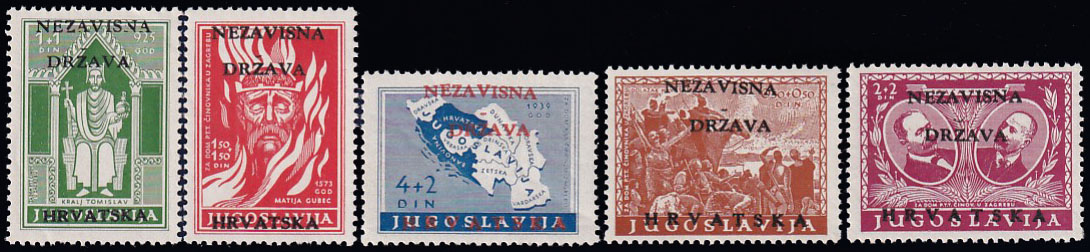 - Marke kraljevine Jugoslavije Michel br. 413/417 s trorednim pretiskom NEZAVISNA / DRŽAVA / HRVATSKA u crnoj boji.
