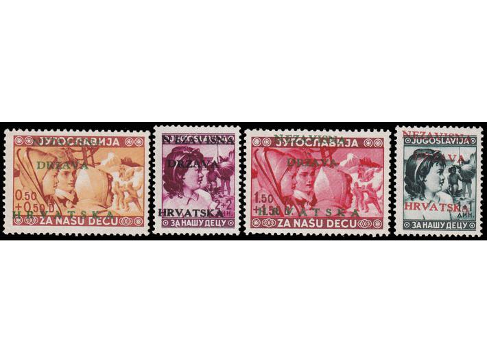 • Marke kraljevine Jugoslavije Michel br. 418/421 s trorednim pretiskom NEZAVISNA / DRŽAVA / HRVATSKA u crnoj, zelenoj i crvenoj boji.