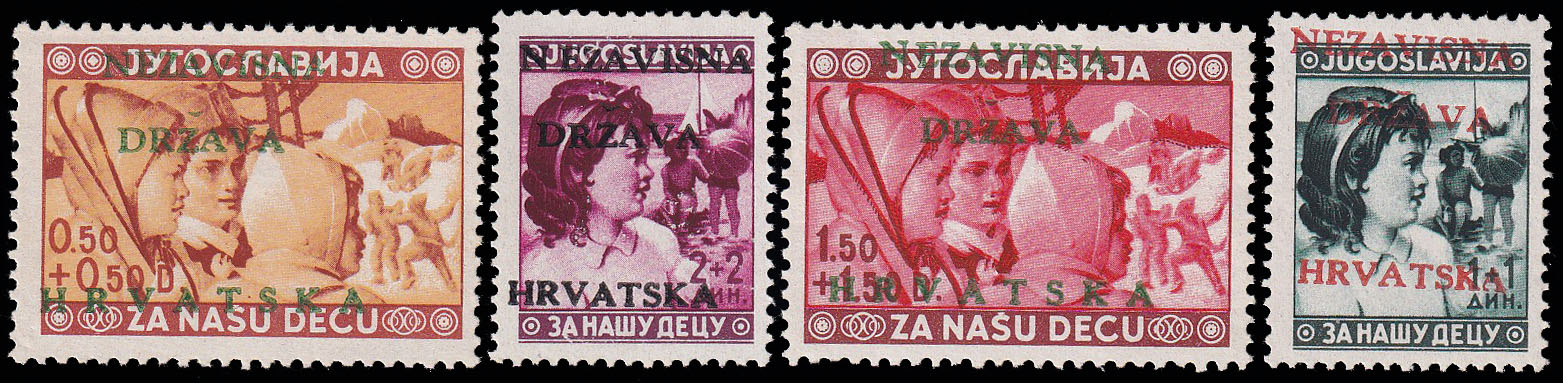 Marke kraljevine Jugoslavije Michel br. 418/421 s trorednim pretiskom NEZAVISNA / DRŽAVA / HRVATSKA u crnoj, zelenoj i crvenoj boji.
