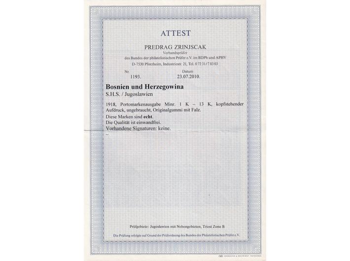Opis: Michel br. 1/13 porto, obrnuti pretisak, fotoatest Zrinjšćak. Dobra kvaliteta.