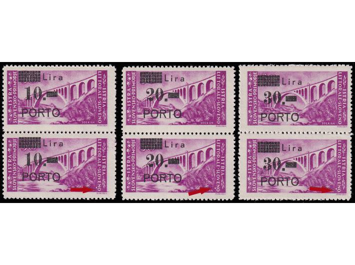 • Michel br. 11/13 okomiti parovi sve tri donje marke s pogreškom tiska 47 polja, bijela mrlja ispod slova NO u riječi SLOVENO.