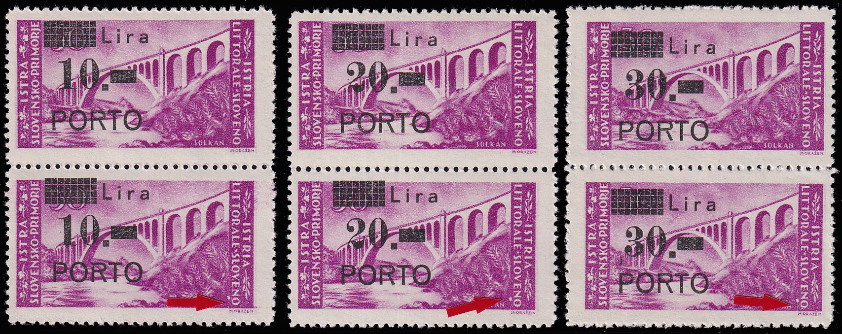 Michel br. 11/13 okomiti parovi sve tri donje marke s pogreškom tiska 47 polja, bijela mrlja ispod slova NO u riječi SLOVENO.