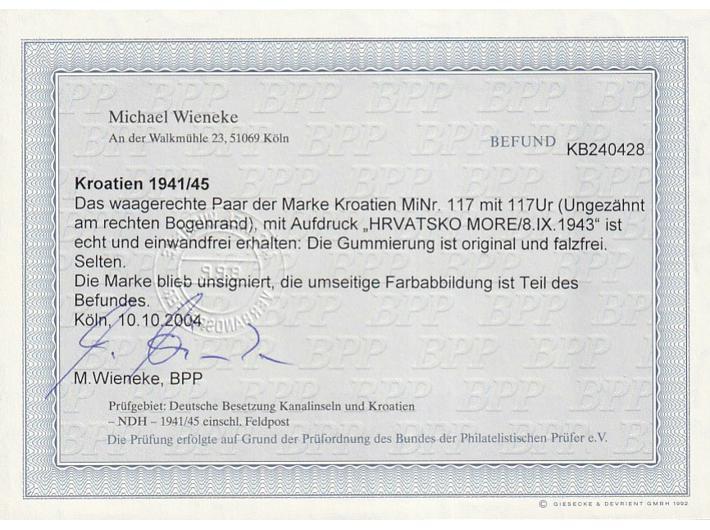 Opis: Michel br. 117 Druga marka okomito nezupčana. Opisano u BP pod 117 SP-I. Odlična kvaliteta, fotoatest Wieneke.