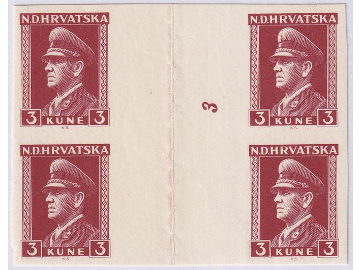 Michel br. 134 nezupčani četverac s mostom između dva tiskarska arka i brojem tiskarske ploče 3.