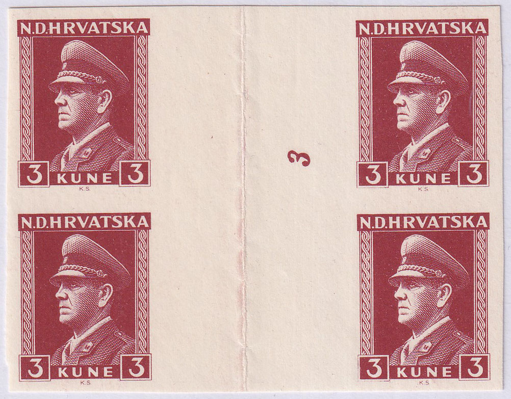 • Michel br. 134 nezupčani četverac s mostom između dva tiskarska arka i brojem tiskarske ploče 3.
