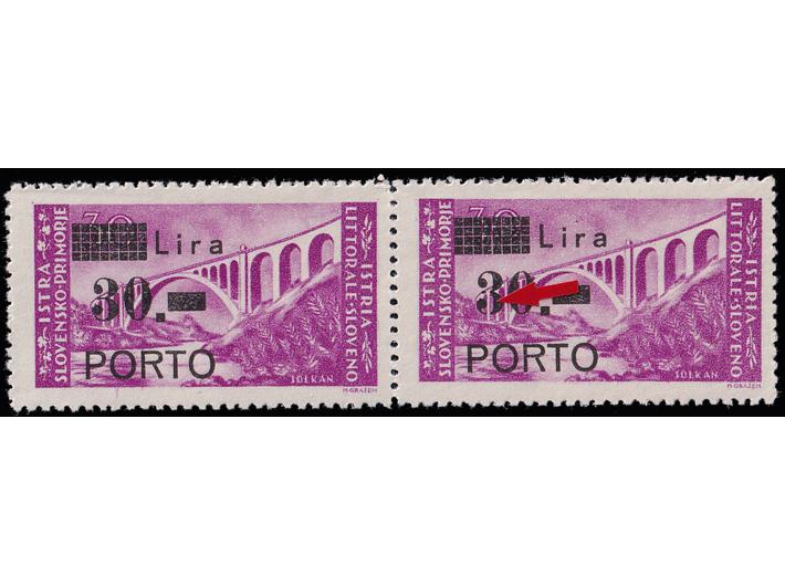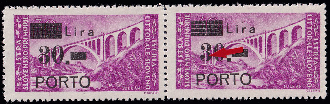 - Michel br. 16 vodoravni par provizorne porto marke kod koje je desna marka s pogreškom pretiska 55 polja, okomito prerezan 3 u 30.