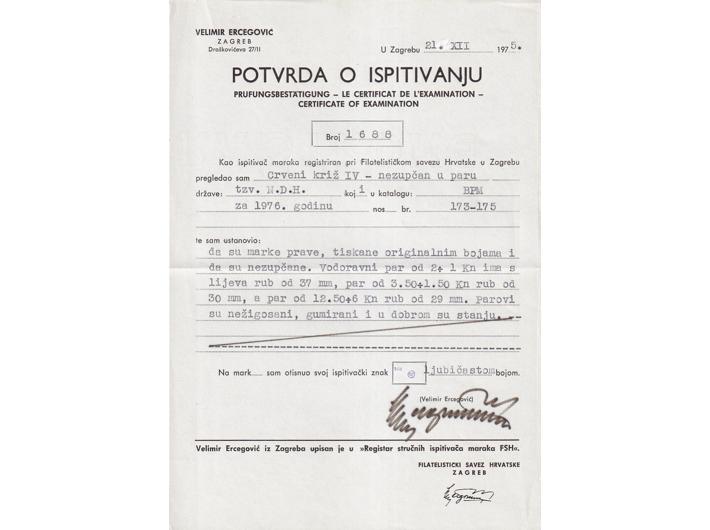 Opis: Michel br. 167/169 nezupčani niz. Atest Ercegović iz kojega je vidljivo da su atestirani parovi, no sada je na ponudi samo niz s puncama i brojem atesta. Odlična kvaliteta.