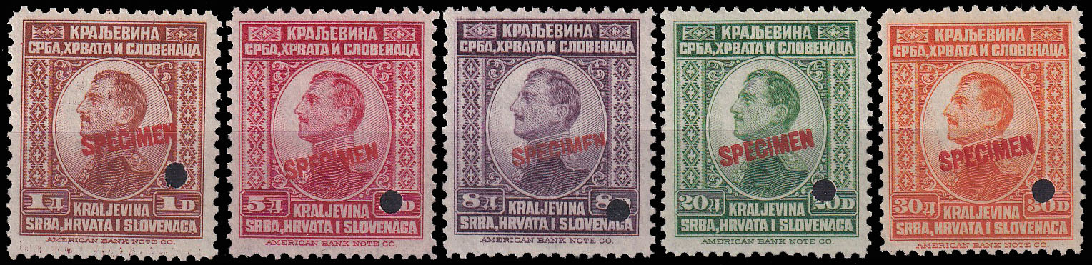 Opis: Michel br. 169/173 kompletan niz s pretiskom SPECIMEN u crvenoj boji i rupom desno dolje kao tiskarski oblik poništavanja marke. Odlična kvaliteta.