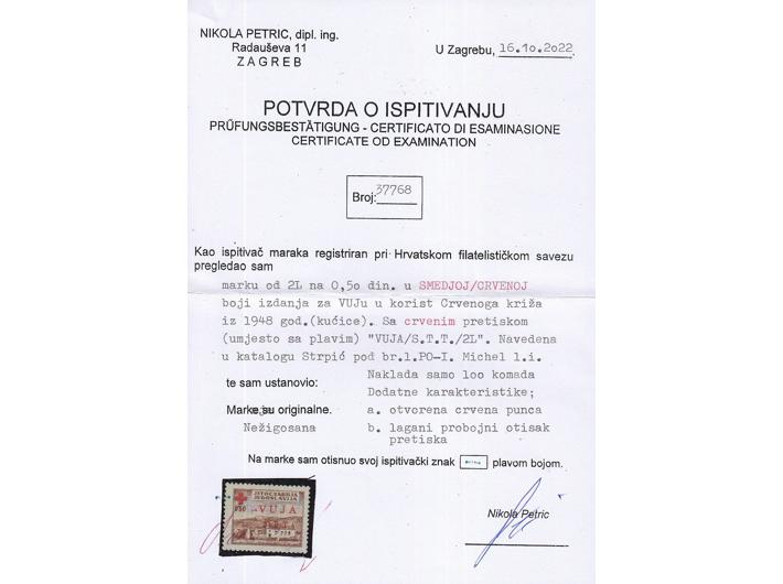 Opis: Michel br. 1I porto „crvena kućica“. Naklada 100 kom. Vrlo rijetka marka. Fotoatest Petric, punca Jugofilatelija.