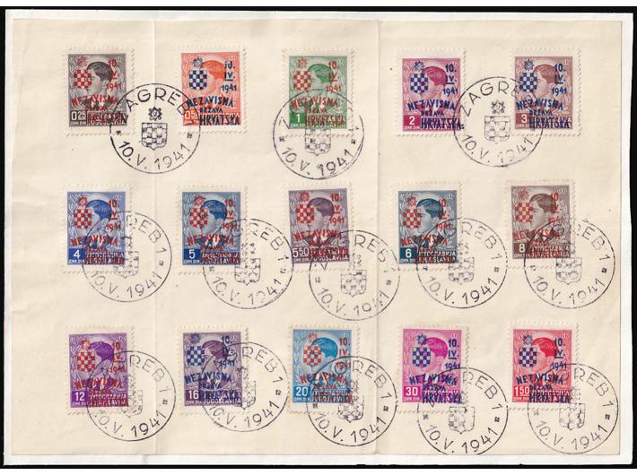 Opis: Michel br. 24/38 niz naljepljen na papir i žigosan prigodnim žigom. Papir okomito savinut na dva mjesta između maraka. Neke marke imaju sitna oštećenja slike. Atest Ekrem Spahich (CPS).