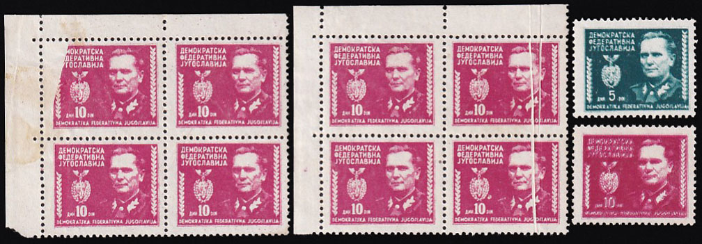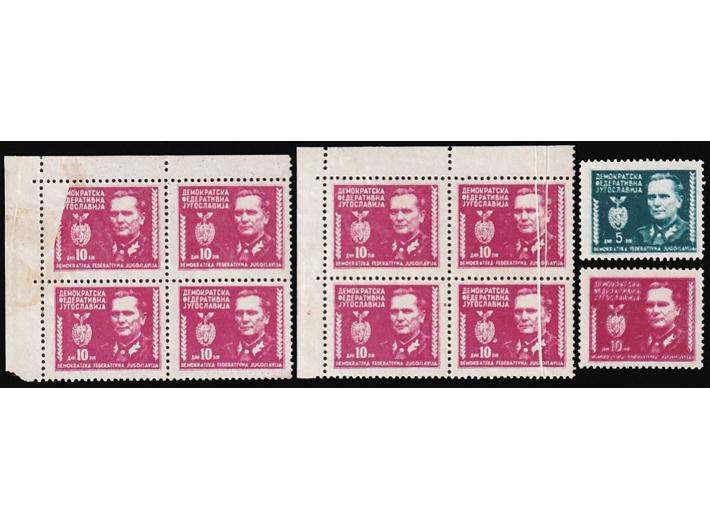 - Michel br. 455 četverac s nekompletno otisnutom slikom kod prve marke i četverac